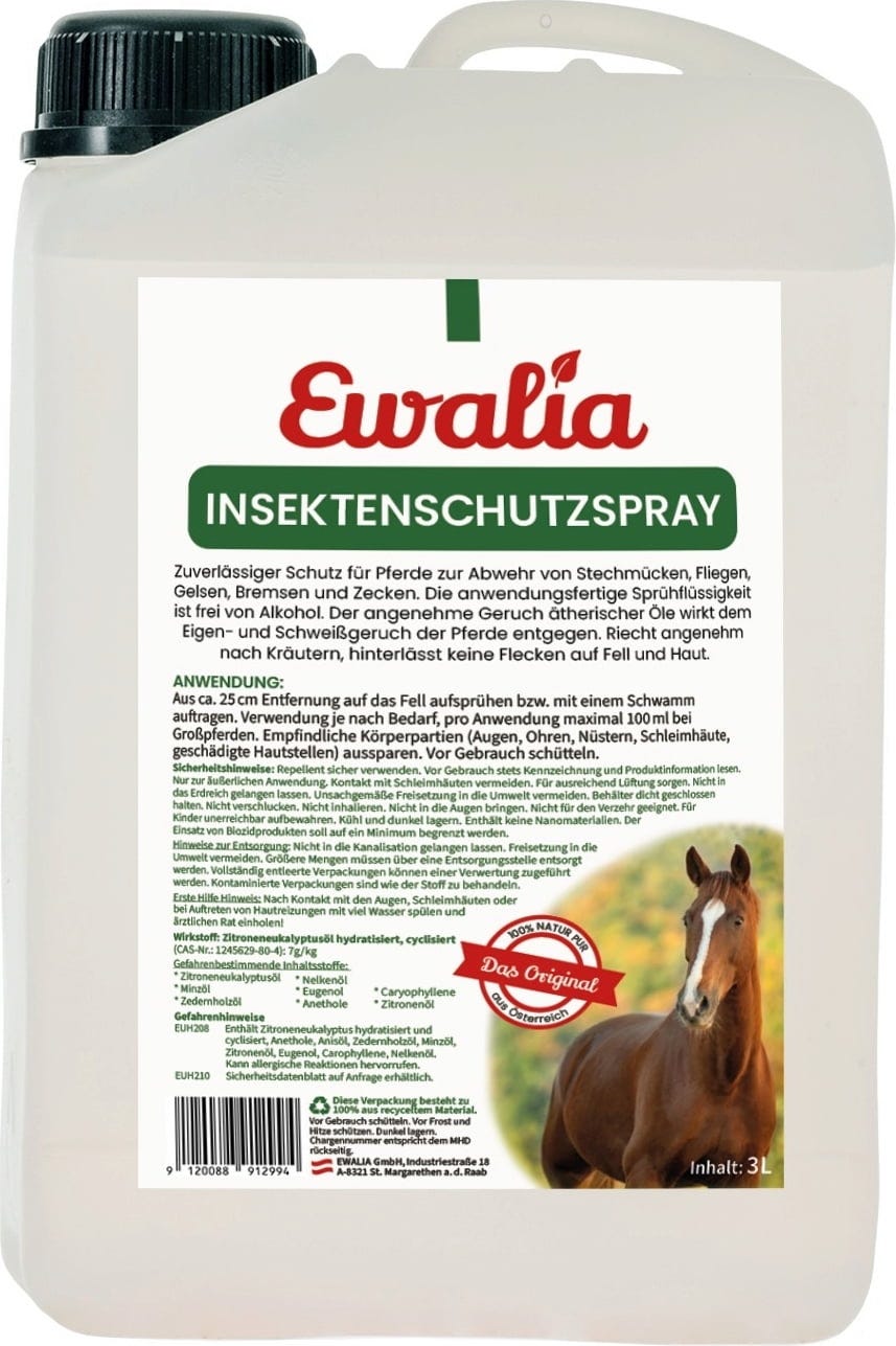 EWALIA's insect repellent spray is an effective and chemical-free protection for horses against flies, gnats, mosquitoes, horse flies and ticks. Apply it as needed, avoiding the eyes and nostrils. The spray has a very pleasant scent and is effective at keeping insects away.