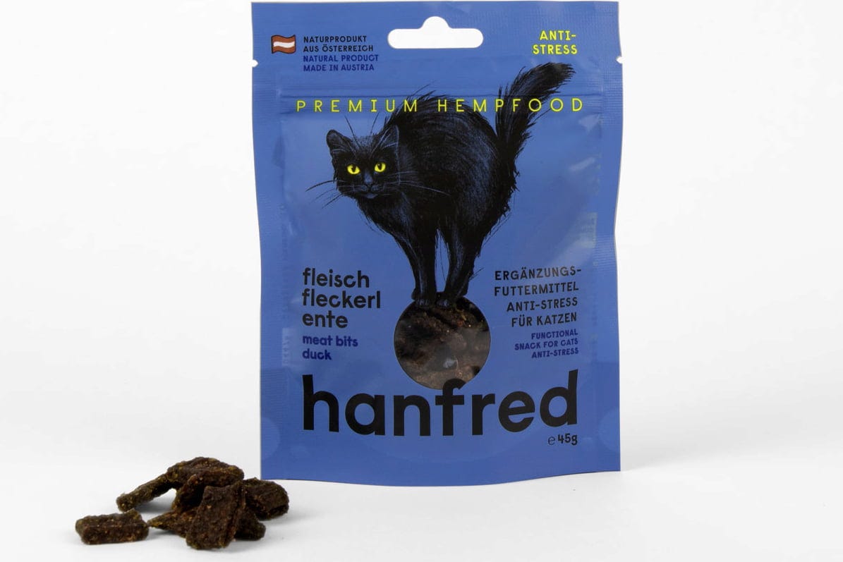 If your cat is sensitive to changes or stressful situations, this snack could be a good choice. Hanfred Meat Bites are made with 95% meat and 5% hemp powder – completely free from grain and artificial additives.