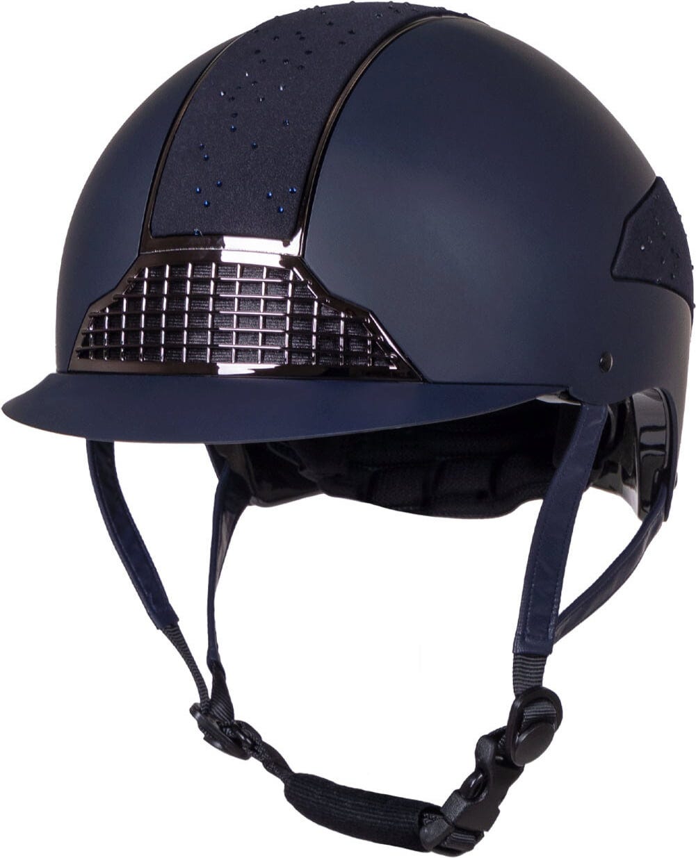 The Ohio riding helmet by QHP is a comfortable and stylish choice for both training and competition. Its eye-catching design features sparkling rhinestones integrated into the outer shell, which is crafted from a combination of high-quality materials for a refined, elegant look. Despite its sturdy construction, the helmet remains impressively lightweight.